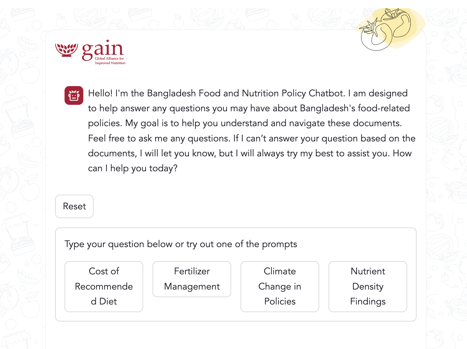 Chatbots based on artificial intelligence (AI)-powered large language models could help solve this problem: they enable users to ask plain language questions and get plain language answers back. But those publicly available online, like ChatGPT, can draw on unreliable sources and often lack context-specificity. To address this challenge, we sought to develop a custom chatbot that would help users explore the food policies of Bangladesh, drawing directly on the contents of policy documents.