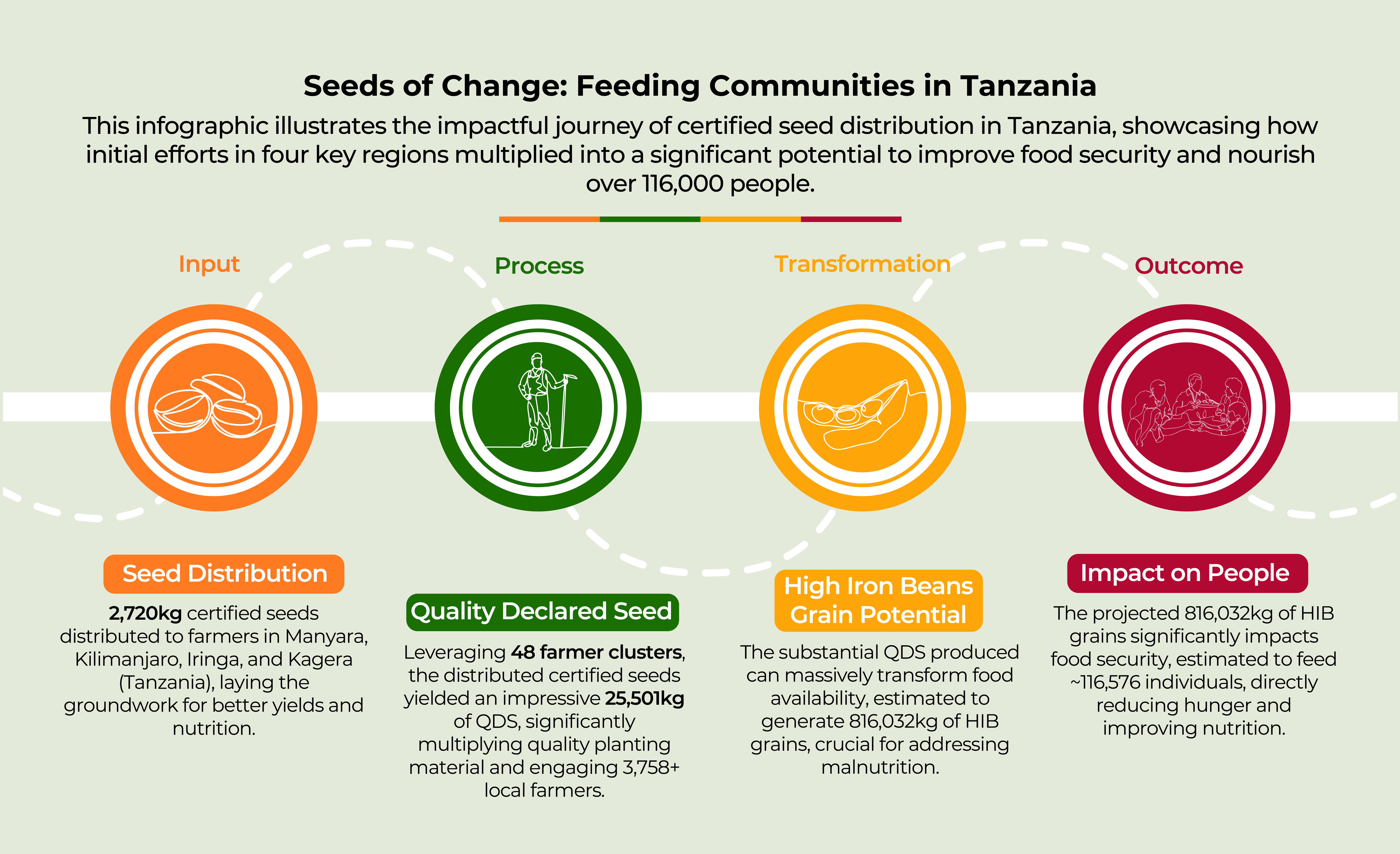 Between 2022-24, 2,720kg of certified seeds were distributed to farmers in the Manyara, Kilimanjaro, Iringa and Kagera regions of Tanzania. This yielded 25,501kg of QDS from 48 farmer clusters, with at least 3,758 farmers registered under the clusters. The 25,501kg of QDS was estimated to produce 816,032kg of HIB grains, enough to feed 116,576 people.