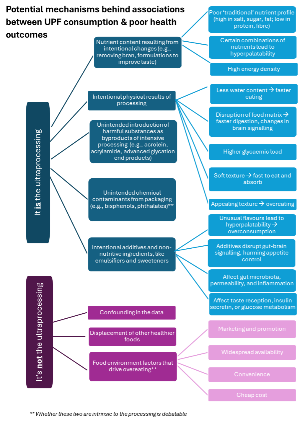 But providing more specific guidance on which UPFs should be strongly discouraged (or even banned), which are acceptable, and whether there are opportunities for beneficial reformulation requires clarifying the mechanisms driving the observed negative effects. My attempt to understand the many that have been proposed is shown in the figure below. I expect it’s probably a combination of most of these, depending on the specific food in question. (Though given the results of prior research, including large observational cohort studies and multiple RCTs, it’s almost certainly not only confounding, traditional nutrient content, food environment, or displacement – though these may all play some role.)