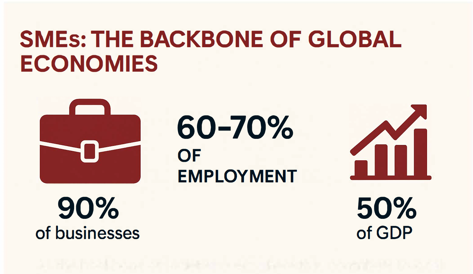 SMEs account for 90% of businesses, 60 to 70% of employment and 50% of GDP worldwide, according to the World Bank. As the backbone of societies everywhere they contribute to local and national economies sustaining livelihoods for the very poor among us.