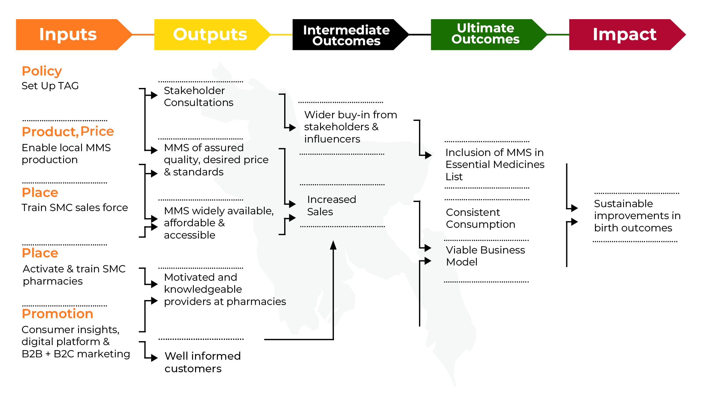 By the Year 2028, MMS 2.0 aims to increase the sales and demand for multiple micronutrient supplements (MMS), increase adherence, and establish a sustainable, market-based model driven by increasing sales margins and cost reduction. The initiative targets annual sales exceeding 40 million tablets, aiming to reach between 300,000 and 500,000 pregnant women—representing 10% to 18% of pregnancies in Bangladesh. The project will cover 41% of the total pharmacy network, including the SMC Star Network, and will implement community-based antenatal care (ANC) services across 137 Upazilas (sub-districts), reaching over 200,000 pregnant women. Through these efforts, the cost per woman for ANC services and MMS is expected to reduce from USD 13.07 to USD 4.03 by 2028. Furthermore, MMS is expected to be fully integrated into national policies, including the National Plan of Action on Nutrition (NPAN3), the 2nd National Nutrition Program (NNP) and the Essential Medicines List (EML), ensuring long-term impact and sustainability.