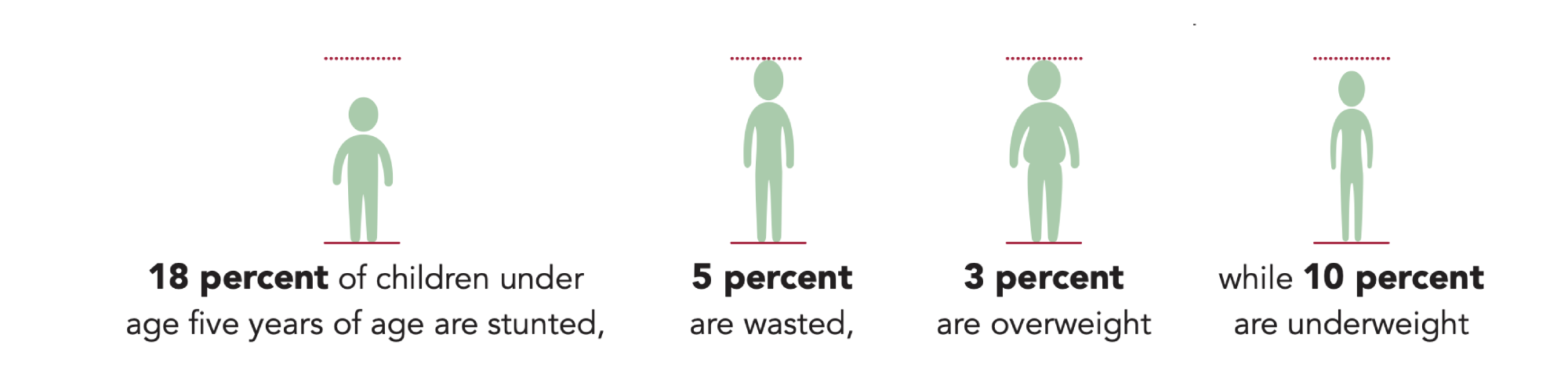 Kenya is grappling with a triple burden of malnutrition where undernutrition, micronutrient deficiencies, and overnutrition and associated diet-related non-communicable diseases coexist. An estimated 23 million Kenyans are undernourished. The Kenya Demographic Health Survey (2022) revealed that 18% of children under age 5 are stunted, 5% are wasted, and 10% are underweight. The survey found rates of obesity that were equally alarming—17% of women and 4% of men. These figures are far above global health targets, indicating that we still have a long way to go.