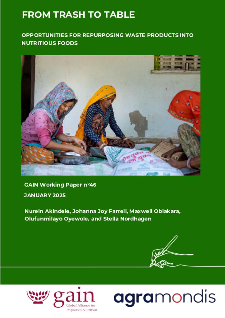 Reducing food waste represents an important opportunity for shrinking the environmental footprint of food systems and supporting planetary health – and if this waste can be repurposed into nutritious foods, then it could also be a benefit for nutrition and human health. To understand the opportunities for repurposing waste products or byproducts into foods, this paper presents a rapid analysis based on desk research and key informant interviews. The analysis considers byproducts across four categories: fruit and vegetable residues, seeds and seed residues, other plant byproducts, and animal byproducts. The assessment considered availability, potential uses, consumer acceptability, food safety, nutritional quality, and feasibility.
